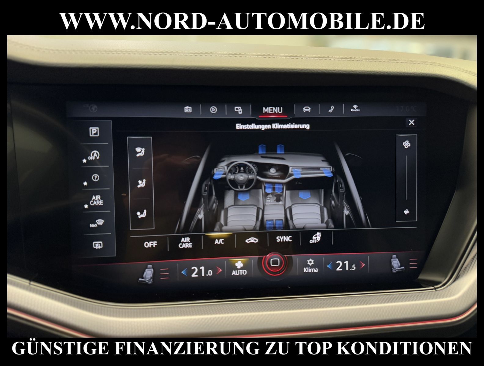 KomfortExtrasUnterhaltungBeschreibungwww.nord-automobile.de Volkswagen Touareg R-Line 4Motion 3.0 TDI SCR 210kW 8-Gang Tiptronic 4 TürenAnsprechpartner: Jan Feldhus, Jonathan Steinfeld, Tom Bijman, Simon Wolff* FAHRZEUG-NUMMER: M-6512-BD * LACKIERUNG: Deep Black Perleffekt * Modelljahr: 2021 * UPE brutto 93.779 ¤ * Deutsche Auslieferung * Abgasnorm Euro 6d-TEMP * R-Line ''Exterieur Black Style'' Volkswagen R * 4 Corner Luftfederung mit elektrisch geregelter Dämpfung * Ausstattung R-Line * LED-Scheinwerfer * Spurwechselassistent * Schlüsselloses Schließ- und Startsystem ''Keyless Access'' mit Safe-Sicherung * Spurhalteassistent plus Emergency Assist und Stauassistent * Rückfahrkamera ''Rear View'' * Parklenkassistent (Park Assist) und PDC vorn und hinten * Panorama-Ausstell-/Schiebedach * Müdigkeitserkennungserkennung * Mirror Link plus Wireless RSE ''App'' * Active Info Display, mehrfarbig, verschiedene Info-Profile wählbar * Autom. Distanzregelung (ACC inkl. Stop&Go-Funktion) - Geschwindigkeitsbegrenzungsanlage * Navigationsgerät-Premium * Innovision Cockpit (Instrumente digital und Bedienung über Touchscreen-Farbdisplay) * Klimaanlage ''Climatronic'' mit 2-Zonen-Temperaturregelung * Verkehrszeichenerkennung * Sitzmittelbahnen und -wangeninnenseiten in Leder ''Vienna'', ''R-Line''-Logo in den Vordersitzen * Sitzheizung für Vordersitze getrennt regelbar * Komfort-Paket Keyless Access * Umfeldbeobachtungssystem (Front assist) mit City-Notbremsfunktion * 2 USB-C-Schnittstellen vorn, 1 USB-C-Ladebuchse an der Mittelkonsole hinten * Telefonschnittstelle ''Business'' mit induktiver Ladefunktion * Lenkrad heizbar (Leder, R-Line) mit Multifunktion und Schaltfunktion * Vordersitze elektrisch einstellbar, mit längs verschiebbarer Oberschenkelauflagesowie Fahrersitz mit Memory-Funktion * Memory-Paket * Komfortsitze vorn * Lendenwirbelstützen vorn pneumatisch einstellbar * Rücksitzbank und -lehne asymmetrisch geteilt umklappbar, längs verschiebbar, Lehenneigung einstellbar * Seitenscheiben hinten und Heckscheibe abgedunkelt, zu 65 % lichtabsorbierend * Dynamische Fernlichtregulierung ''Dynamic Light Assist'' für LED-Matrix-Scheinwerfer * Scheibenwaschdüsen vorn automatisch beheizt * Scheinwerfer-Reinigungsanlage * Ambientebeleuchtung mehrfarbig * Kindersitzverankerung für Kindersitzsystem I-Size, 2 x top tether * Leichtmetallräder ''Las Minas'' * Airbag für Fahrer und Beifahrer, mit Beifahrerairbag-Deaktivierung * Radioempfang digital (DAB+) * Lenksäule einstellbar * Kopfairbagsystem für Front- und Fondpassagiere inkl. Seitenairbags vorn * Komfortöffnung Heckklappe (Virtuelles Pedal) plus Easy Close * Außenspiegel elektrisch einstell-, anklapp-, beheizbar und abblendend, Beifahrerspiegelabsenkung und Memory * Kraftstofftank: 90 Ltr. * Diebstahlwarnanlage mit Innenraumüberwachung, Back-up-Horn und Abschleppschutz * 8-Gang-Automatikgetriebe für Allrad * Start-Stopp-System mit Bremsenergie-Rückgewinnung * Reifenkontrollanzeige * Dachhimmel in Titanschwarz * 4 Leichtmetallräder ''Suzuka'' 9, 5 J x 21 in Dark Graphite, Oberfläche glanzgedreht, Volkswagen R * Nord-Automobile - Ihr starker und kompetenter Partner seit über 30 Jahren * Wir bieten Ihnen eine günstige Finanzierung auch ohne Anzahlung über die * AutoEuropaBank - Zweigniederlassung der Volkswagen Bank GmbH an * 20 XXL-Fotografien dieses Fahrzeuges finden Sie unter www.nord-automobile.de * Gerne unterbreiten wir Ihnen ein Angebot zum Ankauf Ihres bisherigen Fahrzeuges * Beim Export-Geschäft führen wir die Ausfuhranmeldung und Zulassung für Sie durch * Wir sind Meister-Werkstatt und zertifizierte GTÜ-Prüfstelle * Lernen Sie uns kennen - wir freuen uns auf Ihren Besuch * Keine Haftung für Druck & Schreibfehler. ... Klima, Klimaautomatik, Automatik, Leder, Navigationssystem, Allrad, Sitzheiz. vorn, Xenon, Vorders. elekt. verstellb., ESP, ABS, Distronic, Parktronic System, Multifunktionslenkr., Radio, Bordcomputer, Spiegel beheizbar, Scheinwerferreinigung, elektr. Fensterheber vorn, Keyless-Go, ZV mit Fernb., Fahrerairb., Beifahrerairb., Seitenairbag vorn, Kopfairbags, Leichtmetallfelgen, Nichtraucher, Sitzbank teilbar, Lenksaeule einstellbar, abklappb. Spiegel, elektr. verstellb. Spiegel, Luftfederung, Mittelarmlehne, elekt. verstellb. Fahrersitz, Sitzheizung, Waermeschutzvergl., aus erster Hand, Schadstoffklasse: Euro 6, Diesel, 4x4-Antrieb, Lederlenkrad, HSN 0603, TSN CGL, Verbrauch: 6,6/7,7/5,2 l/100 km (komb/inn/auß), CO2: 220 g/km, HU + AU wird vor Verkauf erneuert, Feinstaubplakette: 4 - Grün |