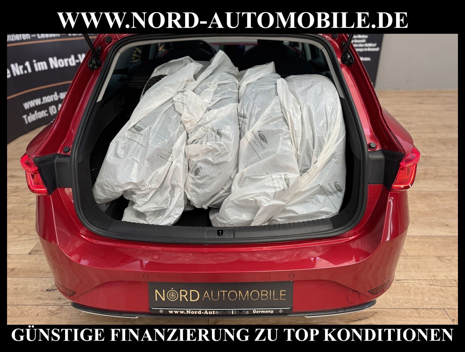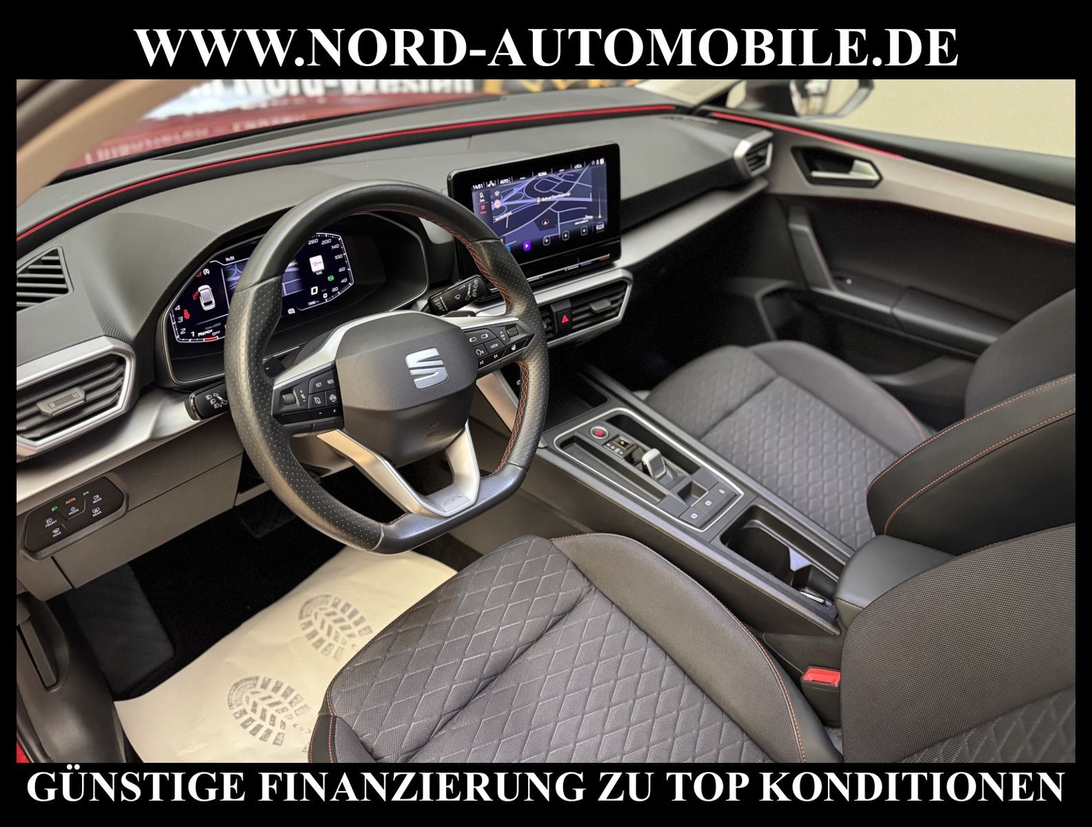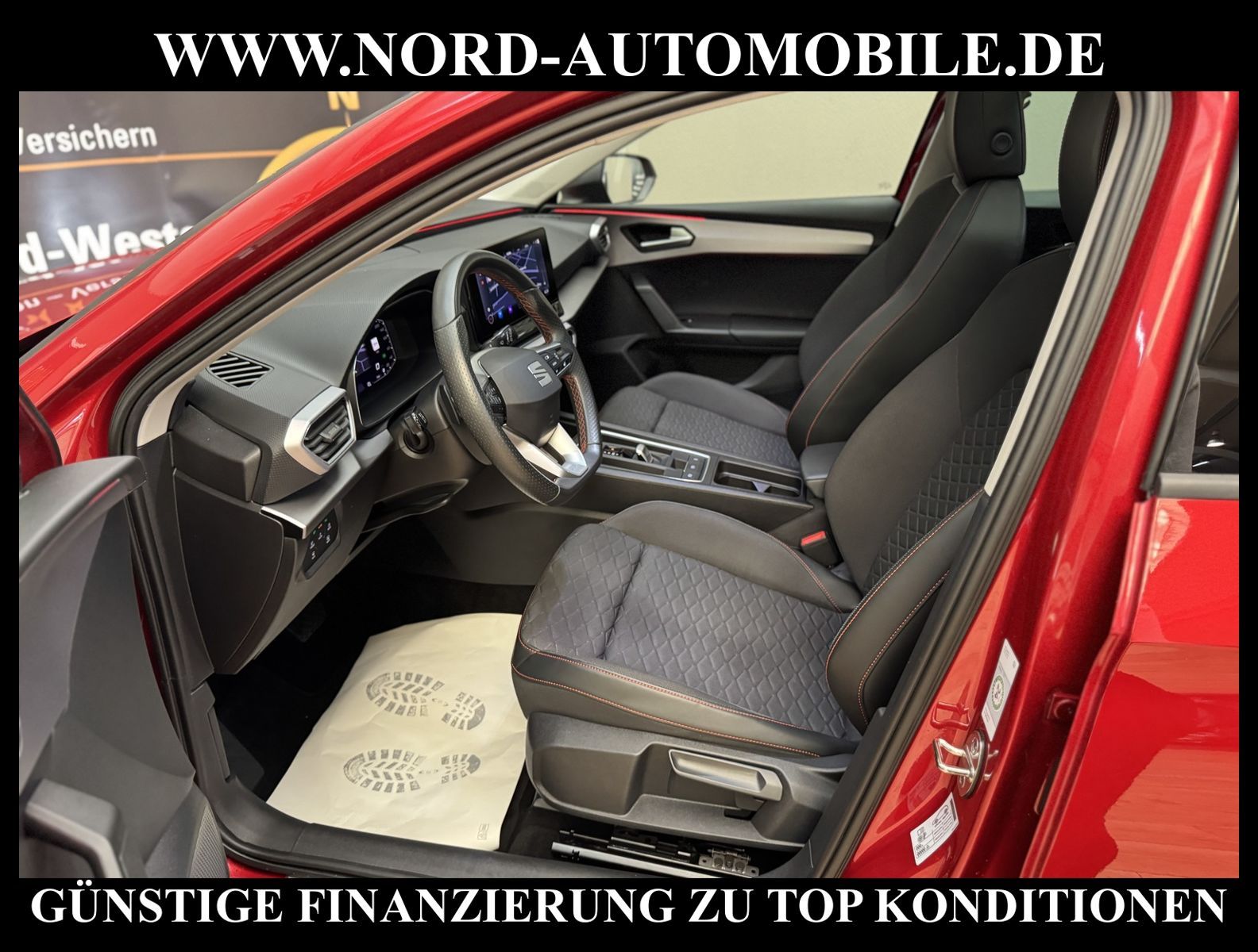 KomfortExtrasUnterhaltungBeschreibungwww.nord-automobile.de SEAT LEON STAnsprechpartner:Jan Feldhus, Jonathan Steinfeld, Tom Bijman, Simon Wolff, Matthis Ullrich* FAHRZEUG-NUMMER: M-2454-BD * LACKIERUNG: Desire Red Metellic * Deutsche Auslieferung * Modelljahr:2021 * UPE brutto 35.979 ¤ * Abgaskonzept, EU6 AP * Panorama-Ausstelldach, elektrisch * Zentralverriegelung ''Keyless-Go''ohne Safesicherung * Spurhalteassistent * Einparkhilfe * Navigationsgerät-High * LED-Scheinwerfer * Wireless RSE ''App'' * Digitaler Radioempfang * Telefonvorbereitung für Handy * Müdigkeitserkennung * Mit Rückfahrkamerasystem * Mit Ausweichunterstützung mit Abbiegeassistent * Geschwindigkeitsregelanlage plus Speed-Limiter * Climatronic ( 3-Zonen ) mit Klimabedienteil hinten * Sitzheizung für Vordersitze getrennt regelbar * Anhängevorrichtung mechanisch schwenkbar und elektrisch auslösbar * Ledermultifunktionslenkrad, beheizbar mit Tiptronic * Lendenwirbelstütze, manuell einstellbar in Vordersitzlehnen * Höheneinstellung, manuell, für Vordersitze * Rücksitzbank ungeteilt, Lehne geteilt umlegbar mit Mittelarmlehne * Servolenkung, geschwindigkeitsabhängig(Servotronic) * Nebelscheinwerfer * Einstiegleisten in den Türausschnitten(beleuchtet) * Scheibenwischer-Intervallschaltung mit Licht/Regensensor * Tagesfahrlicht mit Assistenzfahrlicht u.Coming- u. Leaving-home Funktion automatisch * Fensterheber mit Komfortschaltung und Abschaltsicherung, elektrisch * Scheiben seitlich in Wärmeschutzverglasung, ab B-Säule und hinten dunkel eingefärbt * Radschrauben mit Diebstahlsicherung(nicht abschließbar) * Außenspiegel elektrisch anklappbar-/einstellbar, beheizbar, mit Beifahrerspiegelabsenkung * Sicherheitsinnenspiegel automatisch abblendbar * Airbag FS und BFS, ohne Knieairbag, mit BFS-Deaktivierung * 18''-Leichtmetallräder ''Performance'' 30/4, bearbeitet * Reifendruckkontrolle * Start/Stopp-Anlage mit Rekuperation * 7-Gang-Automatikgetriebe * Nord-Automobile - Ihr starker und kompetenter Partner seit über 30 Jahren * Wir bieten Ihnen eine günstige Finanzierung auch ohne Anzahlung über die * AutoEuropaBank - Zweigniederlassung der Volkswagen Bank GmbH an * 20 XXL-Fotografien dieses Fahrzeuges finden Sie unter www.nord-automobile.de * Gerne unterbreiten wir Ihnen ein Angebot zum Ankauf Ihres bisherigen Fahrzeuges * Beim Export-Geschäft führen wir die Ausfuhranmeldung und Zulassung für Sie durch * Wir sind Meister-Werkstatt und zertifizierte GTÜ-Prüfstelle * Lernen Sie uns kennen - wir freuen uns auf Ihren Besuch * Keine Haftung für Druck & Schreibfehler. ... Klima vorn+hinten, Klimaautomatik, Automatik, Navigationssystem, Sitzheiz. vorn, Regensensor, ESP, ASR, ABS, Parktronic System, Multifunktionslenkr., Radio, Bordcomputer, Tempomat, Spiegel autom. abblendbar, Spiegel beheizbar, elektr. Fensterheber vorn+hinten, elektr. WFS, Keyless-Go, ZV mit Fernb., Fahrerairb., Beifahrerairb., Seitenairbag vorn, Kopfairbags, Leichtmetallfelgen, Nichtraucher, Anhaengerk., Nebelscheinw., Servolenkung, Sportfahrwerk, Sportsitze/Schalensitze, Spoiler, Traktionskontr., Sitzbank teilbar, Dachreling, abklappb. Spiegel, elektr. verstellb. Spiegel, Kopfst. vorn, Gepaeckraumabd., Nebelschlussl., Scheibenbr., Mittelarmlehne, Lendenwirbelst., Sitzhoehenv., Sitzheizung Fahrer + Beif., Lichtsensor, Waermeschutzvergl., 12 V Zusatzanschluss, aus erster Hand, Schadstoffklasse: Euro 6, Frontantrieb, Lederlenkrad, Lederschaltknauf, HSN 7593, TSN APY, Verbrauch: 5,0/6,1/4,3 l/100 km (komb/inn/auß), Partikelfilter, Feinstaubplakette: 4 - Grün |