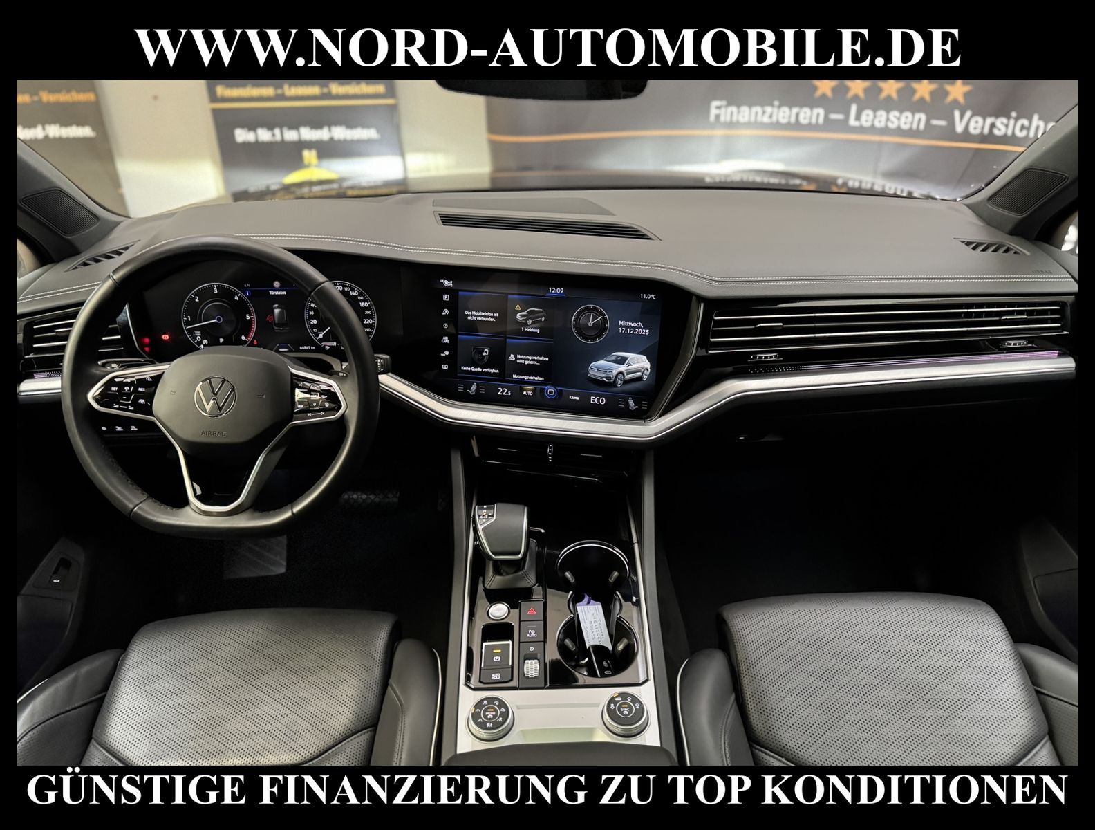 KomfortExtrasUnterhaltungBeschreibungwww.nord-automobile.de Volkswagen Touareg Elegance 4Motion 3.0 TDI SCR 210kW 8-Gang Tiptronic 4 TürenAnsprechpartner: Jan Feldhus, Jonathan Steinfeld, Tom Bijman, Simon Wolff* FAHRZEUG-NUMMER: M-0419- BD * LACKIERUNG: Deep Black Perleffekt * Modelljahr: 2022 * UPE brutto 105.599 ¤ * Unfallfrei * Deutsche Auslieferung * Abgasnorm Euro 6d * R-Line Black Style * 4 Corner Luftfederung mit elektrisch geregelter Dämpfung * Rückfahrkamera mit 360° Umgebungsansicht (Area View) * Head-up-Display * IQ.LIGHT - LED-Matrix-Scheinwerfer * Spurwechselassistent * Digital Cockpit, mehrfarbig, verschiedene Info-Profile wählbar * Schlüsselloses Schließ- und Startsystem ''Keyless Access'' mit Safe-Sicherung * Spurhalteassistent plus Emergency Assist und Stauassistent * Parklenkassistent (Park Assist) und PDC vorn und hinten * Panorama-Ausstell-/Schiebedach * Müdigkeitserkennungserkennung * Mirror Link plus Wireless RSE ''App'' * Sitzbezug / Polsterung: Leder Savona * Dachhimmel in Soul-Schwarz * Active Info Display, mehrfarbig, verschiedene Info-Profile wählbar * Autom. Distanzregelung (ACC inkl. Stop&Go-Funktion) - Geschwindigkeitsbegrenzungsanlage * Sitzheizung für Vorder-/u.Hintersitze, getrennt regelbar * Automatische Distanzregelung ACC ''stop & go'' bis 210 km/h inkl. ''Front Assist'' mit Fußgängererkennung * Navigationsgerät-Premium * Standheizung und -lüftung mit Funkfernbedienung und Vorwahluhr * Verkehrszeichenerkennung * Sonnenschutzrollo an den Türscheiben hinten * Memory-Paket Premium * ''Air Care Climatronic'' mit 4-Zonen-Klimatisierung und Bedienungselementen hinten * Komfort-Paket Keyless Access * Umfeldbeobachtungssystem (Front assist) mit City-Notbremsfunktion * 2 USB-C-Schnittstellen vorn, 1 USB-C-Ladebuchse an der Mittelkonsole hinten * Telefonschnittstelle ''Business'' mit induktiver Ladefunktion * Lenkrad heizbar (Leder) mit Multifunktion und Schaltfunktion * Seitenscheiben in Verbund-Sicherheitsglas, Seitenscheiben hinten und Heckscheibe abgedunkelt * Komfortsitze vorn * Lendenwirbelstützen vorn pneumatisch einstellbar * Lenksäule mit elektrischer Höhen- und Längseinstellung, mit Memory-Funktion * Rücksitzbank und -lehne asymmetrisch geteilt umklappbar, längs verschiebbar, Lehenneigung einstellbar * Vordersitze elektrisch einstellbar, mit Memory-Funktion und längs verschiebbarer Oberschenkelauflage * Ambiente-Paket * Sitze vorn mit Klima- und Massagefunktion * Dynamische Fernlichtregulierung ''Dynamic Light Assist'' für LED-Matrix-Scheinwerfer * Scheibenwaschdüsen vorn automatisch beheizt * Scheinwerfer-Reinigungsanlage * Ambientebeleuchtung mehrfarbig * Frontscheibe in Wärmeschutzglas, geräuschdämmend und beheizbar * Knieairbag Fahrer-/Beifahrerseite, Seitenairbag und Gurtstraffer hinten außen * Kindersitzverankerung für Kindersitzsystem I-Size, 2 x top tether * Radioempfang digital (DAB+) * Airbag für Fahrer und Beifahrer, mit Beifahrerairbag-Deaktivierung, inkl. Knie-Airbag auf der Fahrerseite * Reifenfülldruck-Kontrollsystem * Komfortöffnung Heckklappe (Virtuelles Pedal) plus Easy Close * Außenspiegel elektrisch einstell-, anklapp-, beheizbar und abblendend, Beifahrerspiegelabsenkung und Memory * Diebstahlwarnanlage mit Innenraumüberwachung, Back-up-Horn und Abschleppschutz * 8-Gang-Automatikgetriebe für Allrad * Start-Stopp-System mit Bremsenergie-Rückgewinnung * Dachhimmel in Titanschwarz * Allradlenkung * 4 Leichtmetallräder ''Suzuka'' 9, 5 J x 21 in Schwarz, Volkswagen R * Nord-Automobile - Ihr starker und kompetenter Partner seit über 30 Jahren * Wir bieten Ihnen eine günstige Finanzierung auch ohne Anzahlung über die * AutoEuropaBank - Zweigniederlassung der Volkswagen Bank GmbH an * 20 XXL-Fotografien dieses Fahrzeuges finden Sie unter www.nord-automobile.de * Gerne unterbreiten wir Ihnen ein Angebot zum Ankauf Ihres bisherigen Fahrzeuges * Beim Export-Geschäft führen wir die Ausfuhranmeldung und Zulassung für Sie durch * Wir sind Meister-Werkstatt und zertifizierte GTÜ-Prüfstelle * Lernen Sie uns kennen - wir freuen uns auf Ihren Besuch * Keine Haftung für Druck & Schreibfehler. ... Klima, Klimaautomatik, Automatik, Leder, Navigationssystem, Allrad, Sitzheiz. vorn, Sitzheiz. hinten, Xenon, Vorders. elekt. verstellb., ESP, ABS, Distronic, Parktronic System, Multifunktionslenkr., Radio, Bordcomputer, beheizte Frontscheibe, Spiegel beheizbar, Scheinwerferreinigung, elektr. Fensterheber vorn, Keyless-Go, ZV mit Fernb., Fahrerairb., Beifahrerairb., Seitenairbag vorn, Kopfairbags, Leichtmetallfelgen, Nichtraucher, Sitzbank teilbar, Lenksaeule einstellbar, abklappb. Spiegel, elektr. verstellb. Spiegel, Luftfederung, Mittelarmlehne, elekt. verstellb. Fahre |
